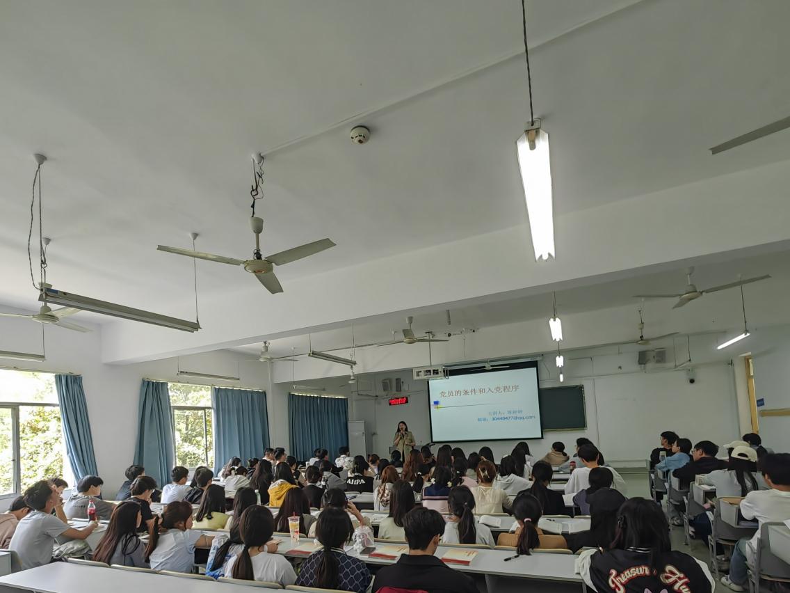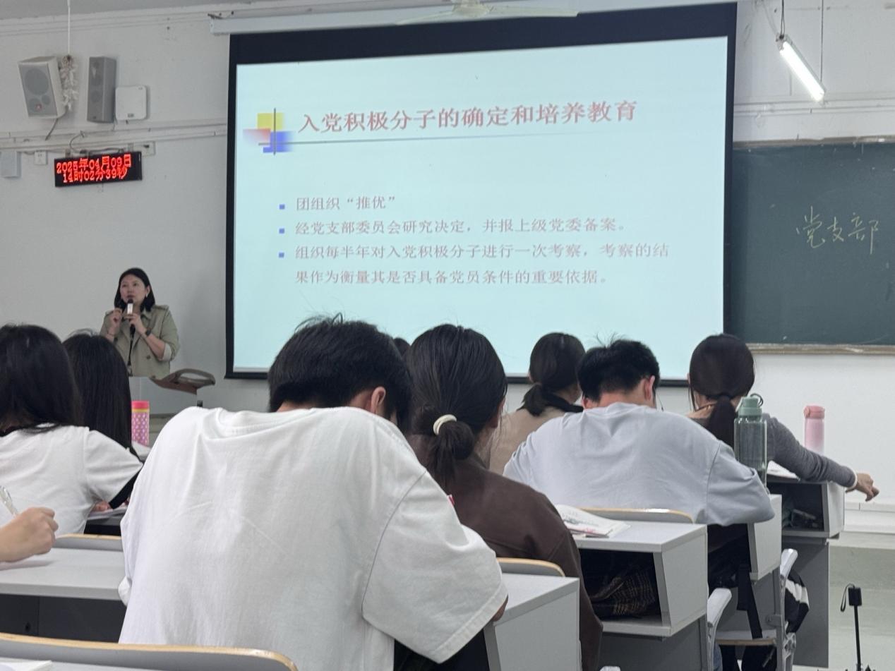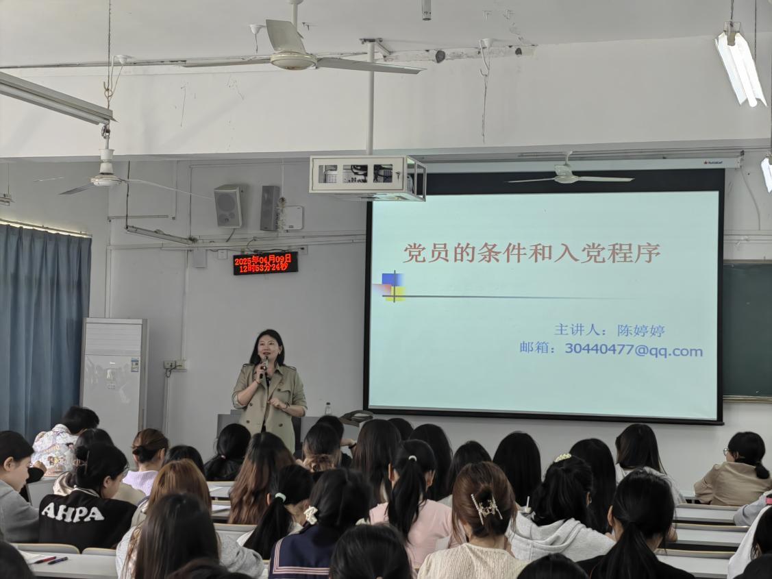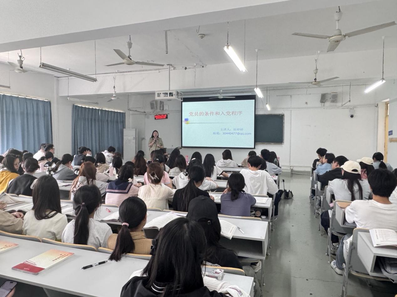 4月9日中午,js333金沙线路检测在博文楼开展了第47期党的基础理论知识学习培训班第二讲——中国共产党党员的条件和入党程序。本次培训由文学与新闻传播学院党总支书记陈婷婷主讲,第47期全体学员参加。