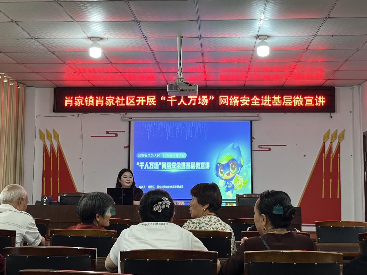 为进一步增强居民网络安全和反电信诈骗意识,5月15日合川区委网信办组织宣传团成员到肖家镇社区开展“千人万场”网络安全主题宣讲活动。此次活动主讲人为学院学生第二党支部教师党员周思忆,她通过“案例解析+互动答疑”形式,为50余名社区居民带来了生动实用的网络安全知识和反电信诈骗宣讲。